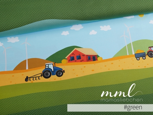 Farm Holidays ist eine Mischung aus Bordüren- und Panelstoff, du findest darauf drei verschiedene Traktorenszenen.Kaufst Du mehr als eine Einheit (eine Einheit misst ca. 65 cm (+/- 5 cm) in der Höhe) bekommst Du den Stoff natürlich am Stück!