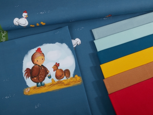 Hier bekommst Du einen tollen Baumwoll-Jersey, welcher zur Serie MiniLiebchen #Kiki Küken & Omlett gehört.