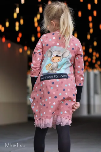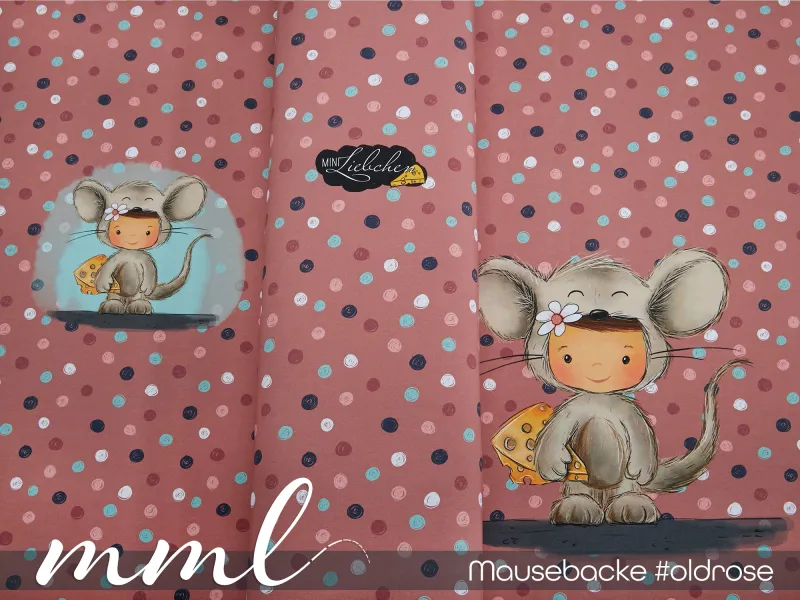 Das MiniLiebchen #Mausebacke ist ein weiteres kleines Kostüm-Kind einer ganze Serie. Das Panel ist dreigeteilt, 1x als Rondell, 1x der MiniLiebchen-Schriftzug und ein großes, angeschnittenes Motiv. Mausebacke ist ein verspieltes Jersey Panel das besonders für Kinder geeignet aber natürlich auch für jeden der sich an dem niedlichen Design erfreut. Das verspielte Panel zeigt Tupfen und zwei Mäuse mit Käse.